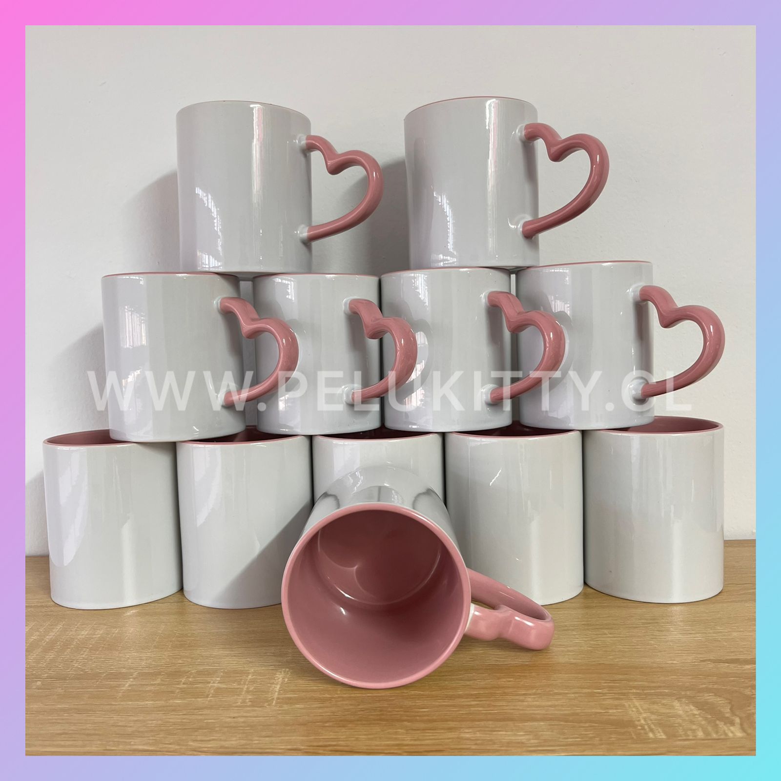 Set 12 Tazones 11 Oz Interior Rosado / Asa Corazón, Sublimación.